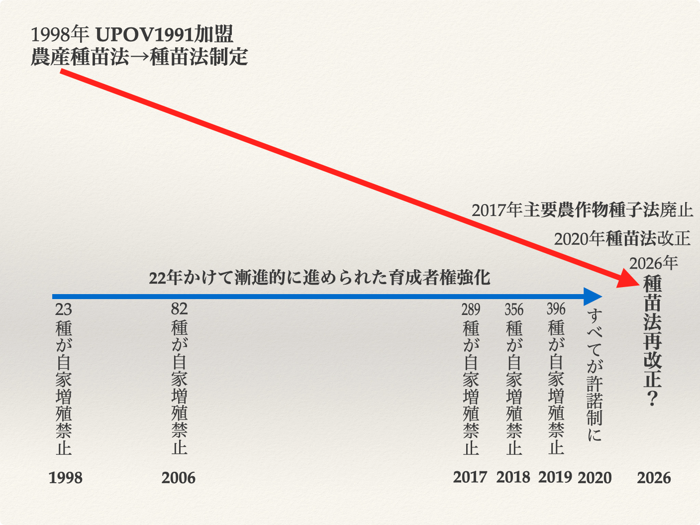 「種子法廃止はけしからん」「種苗法を変えたことは問題だ」という声は時々聞こえてくるけれども、そもそもこのプロセスは種子法廃止に始まったわけでも、種苗法改正で始まったわけでもない。1998年、日本がUPOV1991年条約に加盟して、農産種苗法を廃止して、種苗法を新設した時に始まっている。